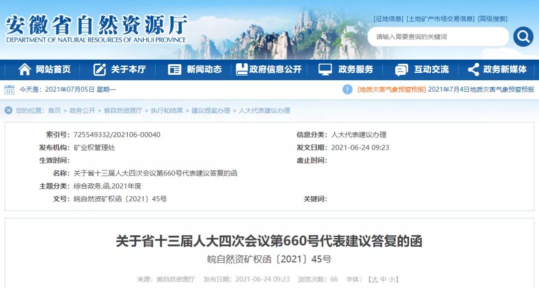 近日,安徽省自然資源廳發(fā)布關(guān)于省十三屆人大四次會議第660號代表建議答復(fù)的函【皖自然資礦權(quán)函〔2021〕45號】,答復(fù)馬勝利代表《關(guān)于加強礦山綜合整治工作的建議》。